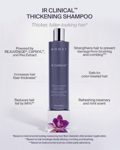 Monat IR Clinical Set Shampoo Conditioner and Serum NEW For Thinning Hair. IR Clinical System/ Brand New in box Densifying Fine to Medium Hair Types All Hair Textures The breakthrough is here! The new IR CLINICAL™ System is a complete regimen that features CAPIXYL™ and a unique blend of ingredients that helps to strengthen and thicken hair while also preventing damage from brushing and combing. Developed in collaboration with a world-renowned expert in hair and scalp science, this lightweight, non-greasy serum is proven to help boost hair growth, immediately reduce breakage, and has shown noticeable results of thicker, fuller-looking hair.o |