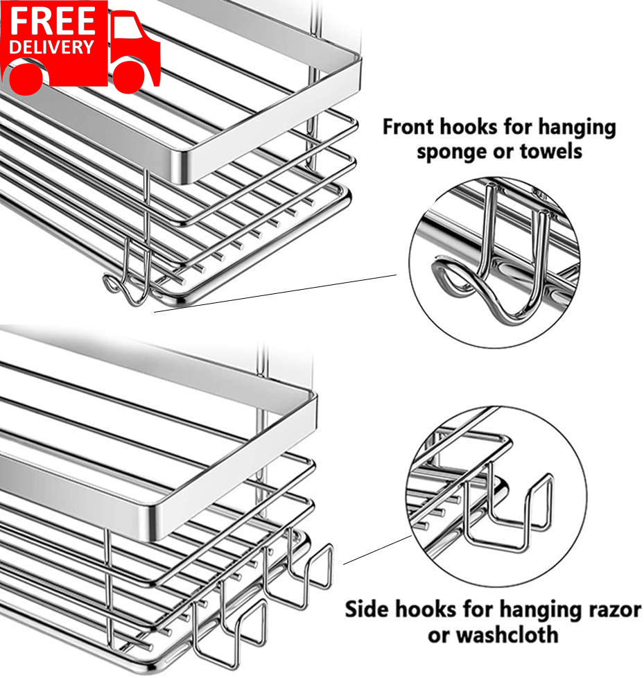 Shower Caddy Basket Shelf with 5 Hooks Adhesive Organizer Storage Rack Rustproof