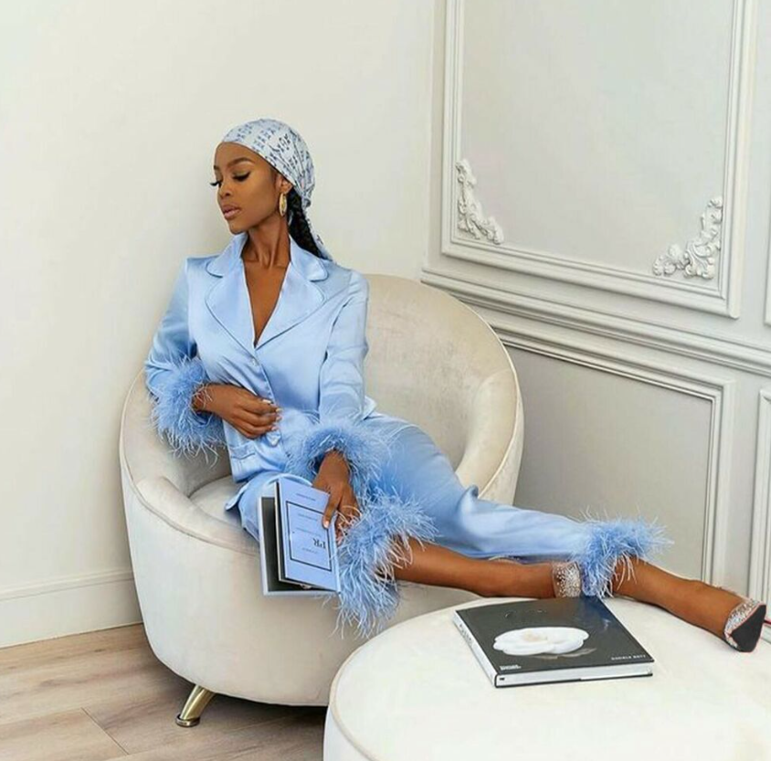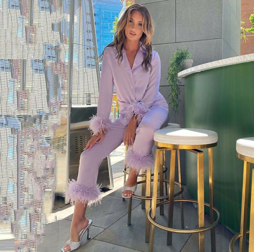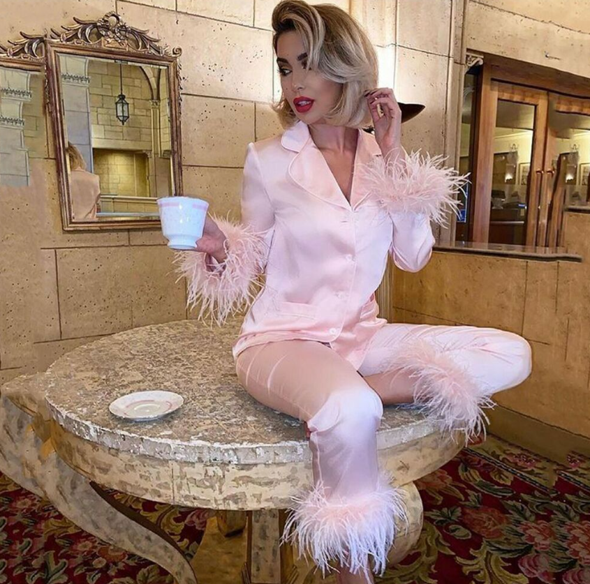 Women Feather Silk Long Sleeve Top+Pant 2 Piece Pajamas Set Sleepwear Nightwear